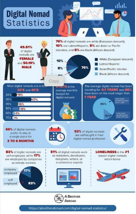 A digital nomad is anyone who works online performing their job. They use mobile technology, which gives them location freedom.